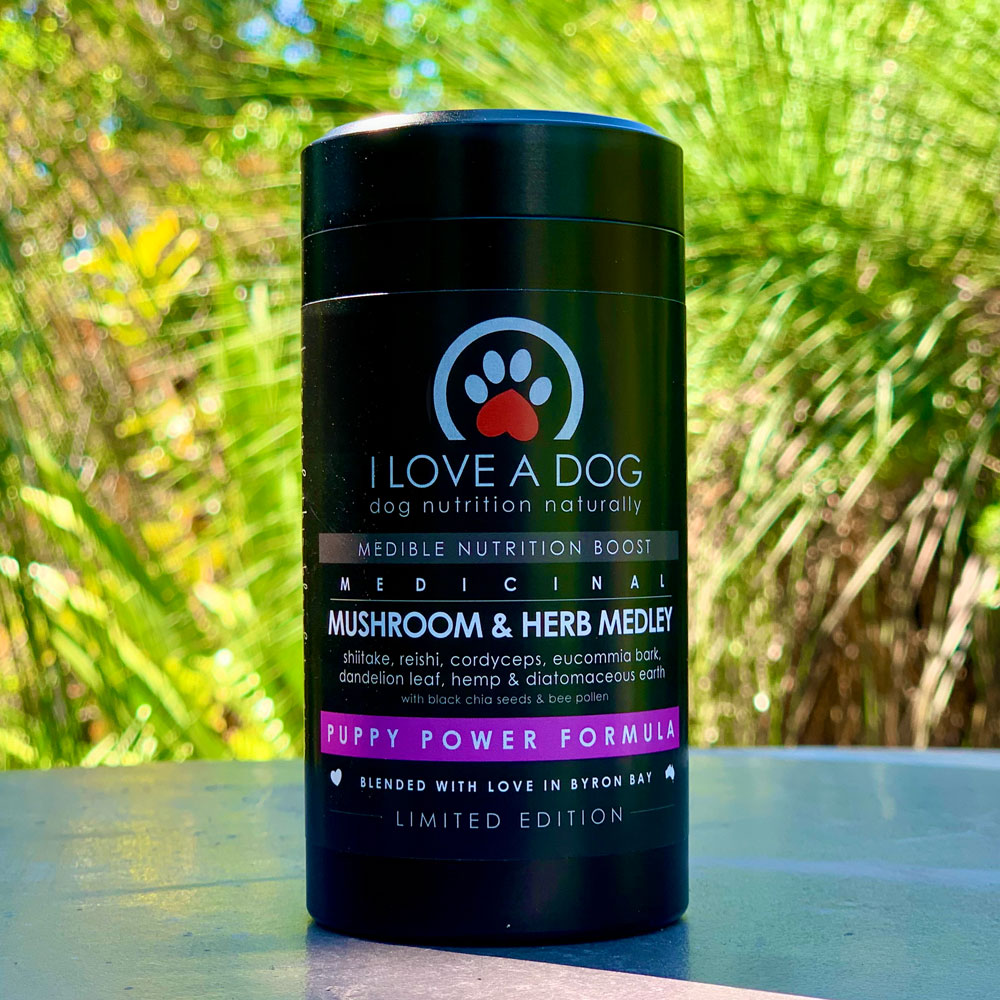 Shiitake, reishi, cordyceps, eucommia bark, dandelion leaf, hemp & diatomaceous earth This Puppy Power Formula is a special blend of medicinal mushrooms, herbs and nutritive medicines designed to help set our puppies up for a happy, healthy life. This medley includes shiitake, considered “elixir of life”, reishi, the “herb of immortality”, cordyceps, the “caterpillar mushroom”, and tonic herb eucommia bark. Together they are wonderful for immunity, cell regeneration, heart health, respiratory and organ function, growing healthy joints, detoxification and have anti-viral, anti-bacterial and anti-parasitic properties.