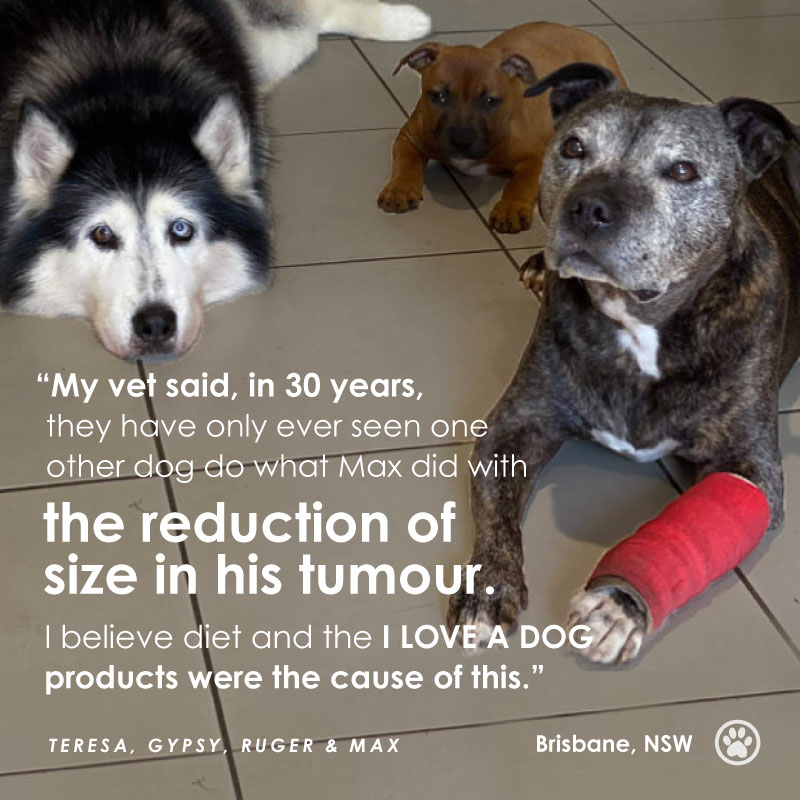 Driven by my own desperate research I found I Love a Dog. It opened my eyes to what we are feeding our dogs and how it can and does help. Our nearly 13 yr old Staffy Max was diagnosed with soft cell sarcoma in his front leg in early 2019. We decided not to amputate due to his advanced arthritis. By September that year, our 12.5 yr old Malamute x Husky Gypsy was diagnosed with a pathological fracture in her hind foot, from Osteosarcoma. We decided not to amputate due to advanced hip weakness/arthritis.