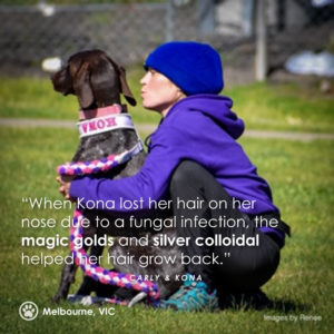 Kona lost her hair on her nose, her biopsy showed a fungal infection in the hair follicles. I’ve found the magic golds and silver colloidal spray have helped her hair grow back.