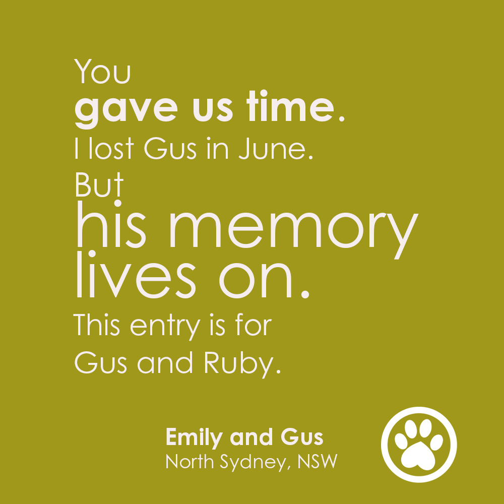 You gave us time. I lost Gus in June. But his memory lives on. Thank you Ruby, love Gus x