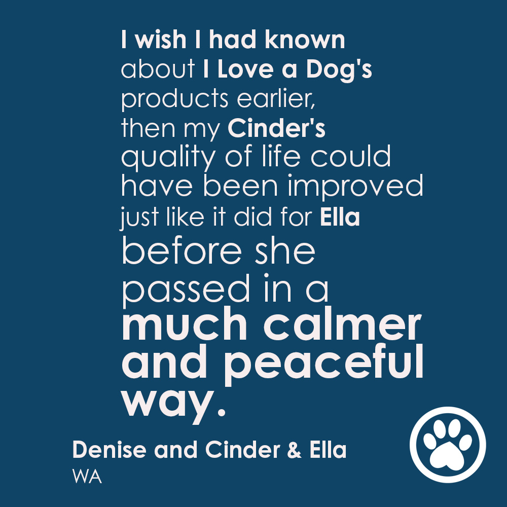 I wished I had know about I Love a Dog’s products earlier, then my Cinder’s quality of life could have been improved just like it did for Ella before she passed in a much calmer and peaceful way.