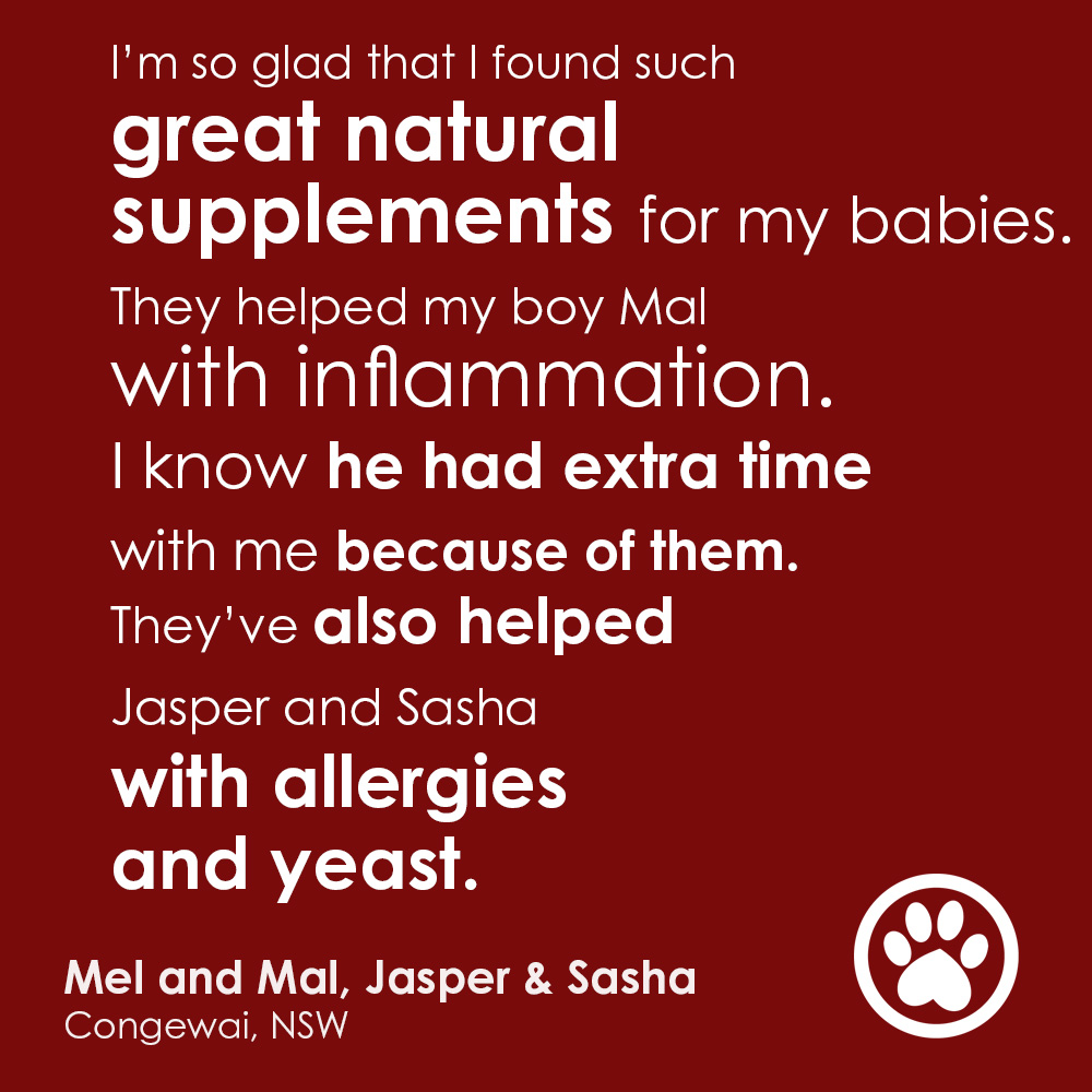 I so glad that I found such great natural supplements for my babies. They helped my boy Mal with inflammation. I know he had extra time with me because of them. They’ve helped Jasper and Sasha with allergies and yeast. I’m also using with our puppies.