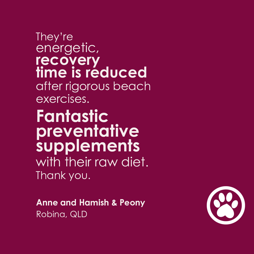 Energetic, recovery time reduced after rigorous beach exercises. Fantastic preventative supplements with their raw diet. Thank you.