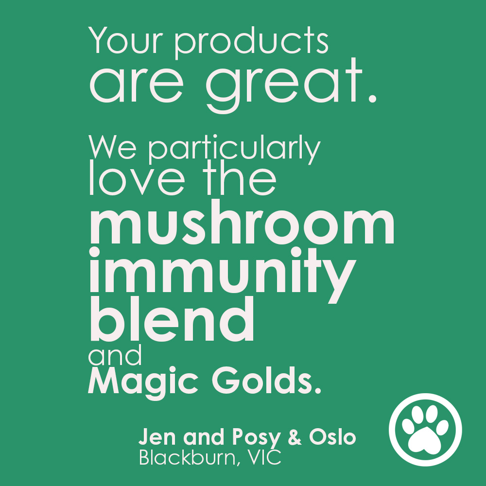 I researched every dog diet and supplement there was to help, I also had great advice from a canine nutritionist. I started feeding the dogs a balanced raw diet and included I Love a Dog Miracle Greens, Magic Golds and Mushroom Medley – Immunity in May.